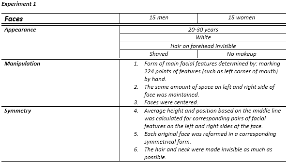 Surprisingly enough, in prior studies of the attractiveness of human faces, a preference for asymmetry was found. The researchers of this article think that this is due to the fact that the faces in the previous studies were made unnaturally symmetric. With this type of research, a photograph is taken of a face and this is then manipulated to make the face symmetrical. This resulted in unnatural properties and changes in the structure of the skin. It is, then, not strange that the participants had a preference for the naturally asymmetric faces. In this research, therefore, a new manipulation technique was used to make the faces symmetric. The form of the facial features is varied and skin structure is kept constant.