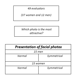 For Experiment 1, two photos were made of each face. A photo was taken of a test subject and this photo was then manipulated using the new technique to make a symmetric face. Thus, there was an original photo and a more symmetrically formed version of the photograph. The photographs were presented in pairs to 49 evaluators. For each pair, they had to choose the most attractive photo.